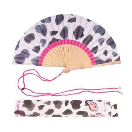 Ventaglio bianco con motivo a mucca dotato di pratico laccio in modo da poterlo avere sempre a portata di mano e non perderlo o dimenticarlo mai!