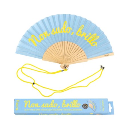 Ventaglio azzurro glow in the dark dotato di pratico laccio in modo da poterlo avere sempre a portata di mano e non perderlo o dimenticarlo mai!