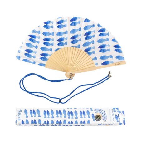 Ventaglio bianco con motivo di pesci dotato di pratico laccio in modo da poterlo avere sempre a portata di mano e non perderlo o dimenticarlo mai!