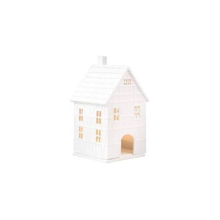 Piccola casetta decorativa in porcellana che rimanda all'architettura dei villaggi del nord Europa, per via delle tipiche strutture in legno.