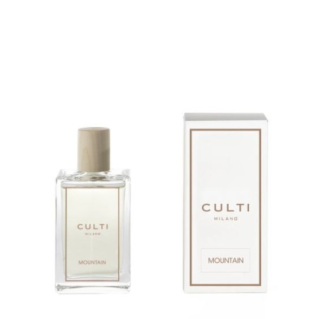Prezioso flacone in vetro trasparente scolpito e squadrato, con serigrafie colorate a secondo della fragranza. Mountain: l’atmosfera accogliente di uno chalet di montagna, il legno scaldato dal camino che emana il suo aroma delicato, lievemente balsamico, quasi orientale.
